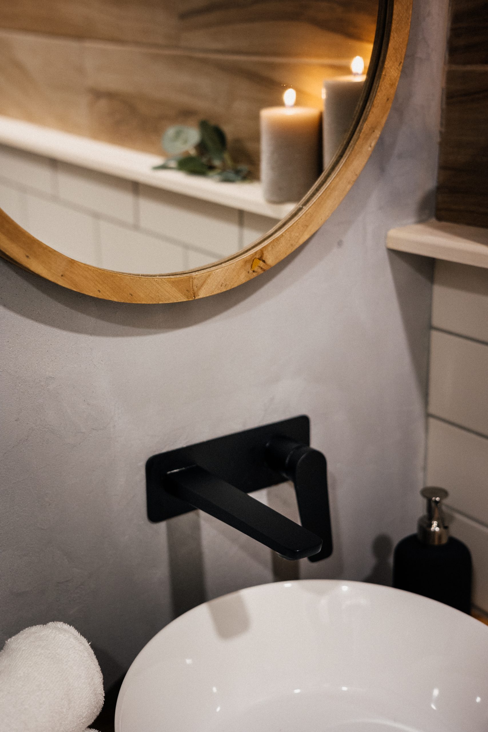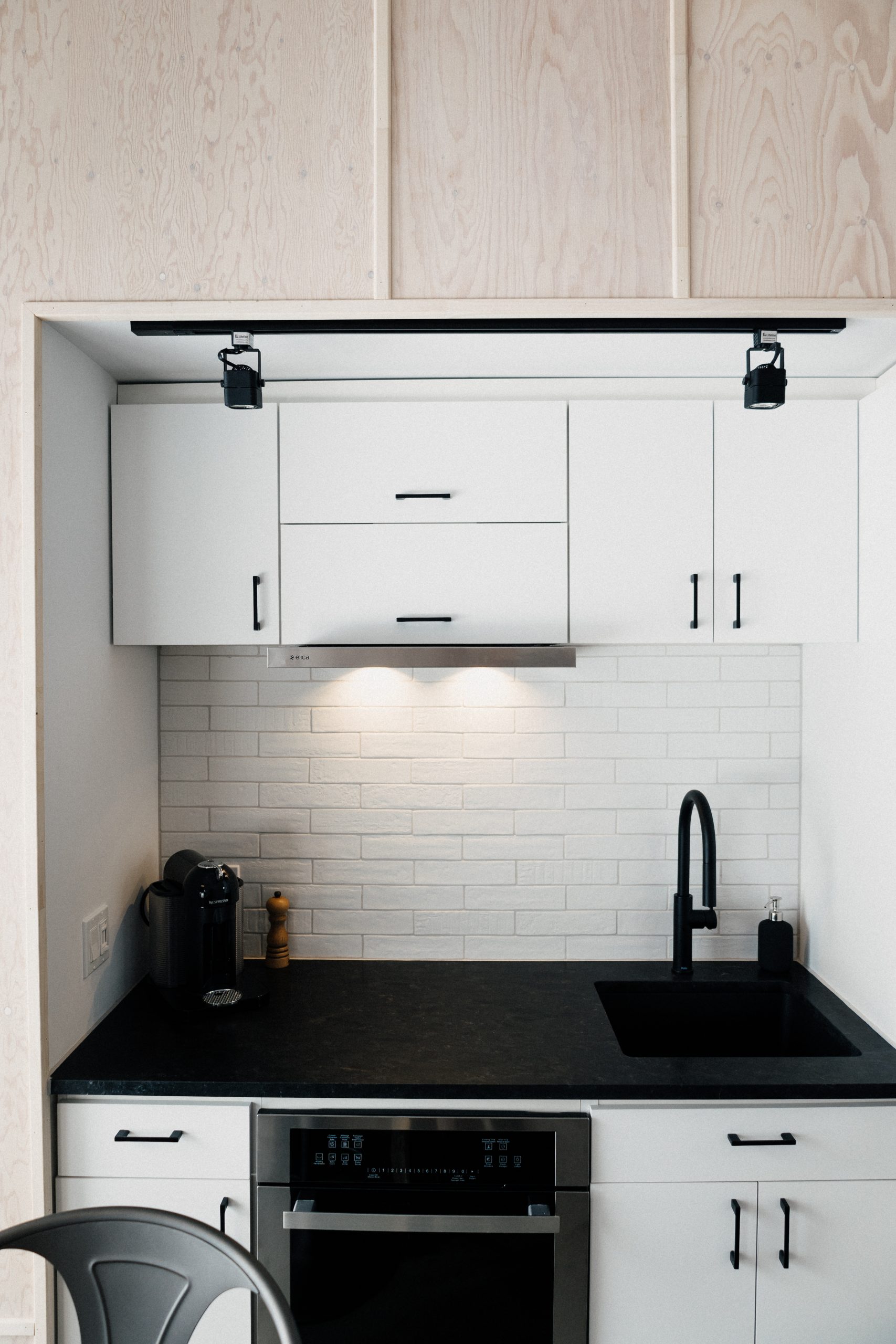 Salle de bain moderne avec plancher chauffant et produits naturels Oneka. Cuisine complète avec machine Nespresso et poêle à fondue électrique.