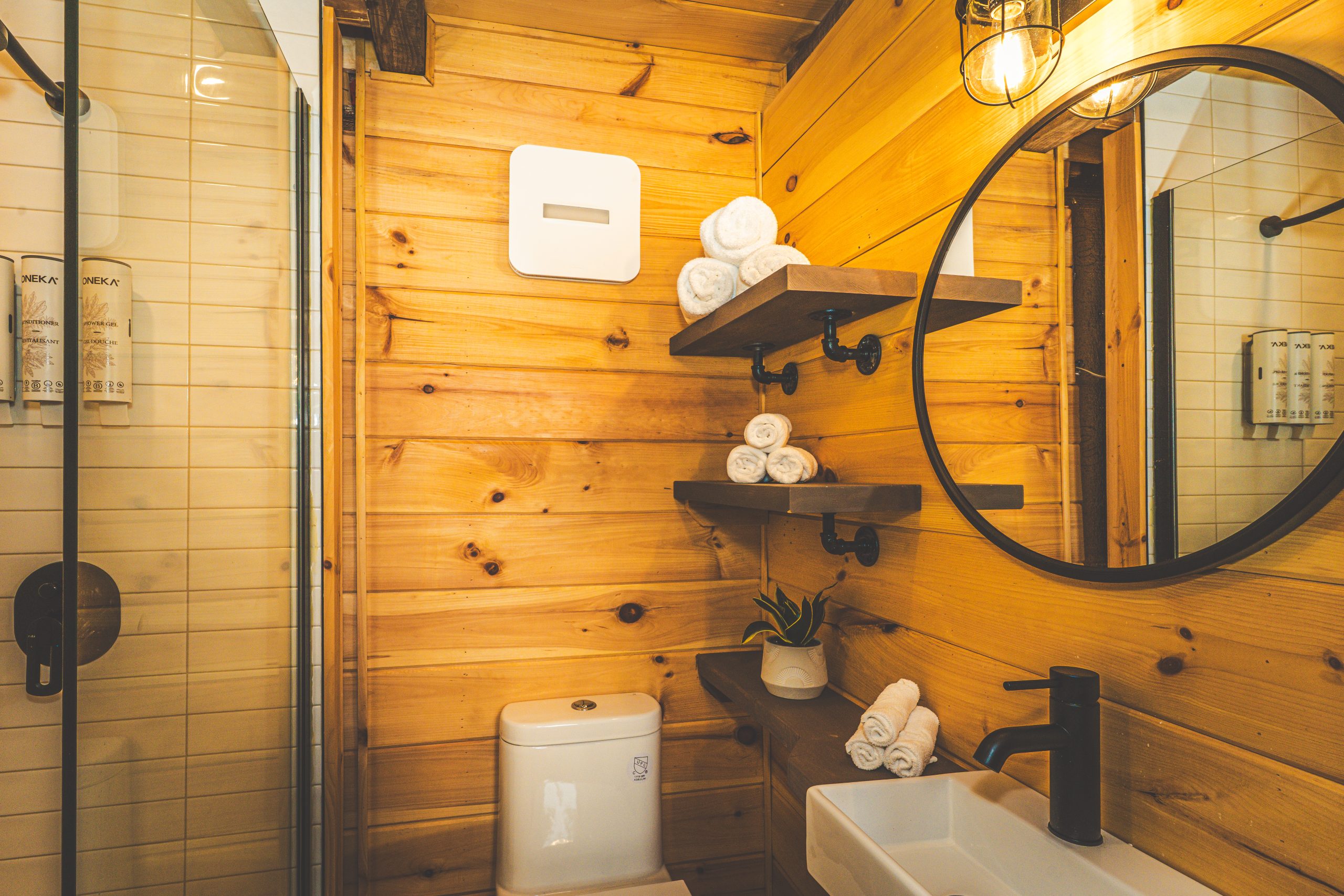 Salle de bain avec douche à l’italienne, plancher chauffant et produits Oneka. Cuisine optimisée avec Nespresso et poêle à fondue.